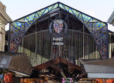 Our first tour was a walking tour ending with a visit to Montjuic. The guide was from Spain, I believe, but not from Barcelona. The tour met off Las Ramblas -- this is plural because it is really a series of ramblas, wide pedestrian streets with shops and restaurants. I read that originally this area was a seasonal riverbed (and sewer) but in the 15th century those were moved, undergrounded I suppose, and the resulting streets were used as markets for various goods. We passed the Boqueria Market, the Gran Teatre del Liceu, and some old and diverse neighborhoods. We saw Bar Marsella, opened in 1820 and retaining its old decor. It was frequented by Dali, Picasso, and Hemingway, but unfortunately was closed the morning when we walked past.